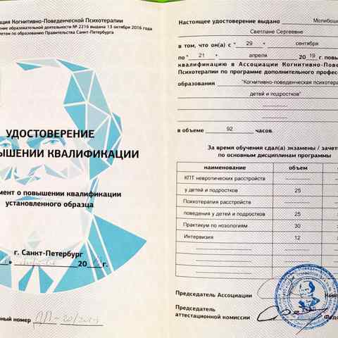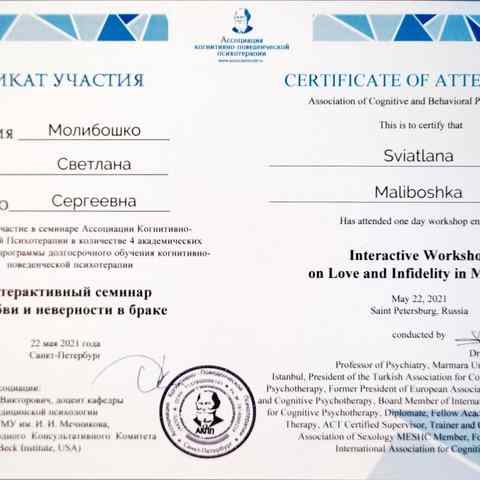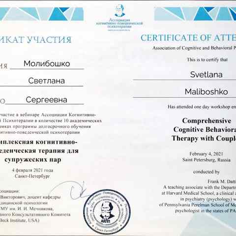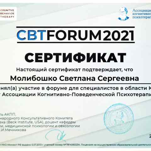 Молибошко Светлана Сергеевна — практикующий психолог ,работающий в научно обоснованном подходе КПТ (когнитивно-поведенческой терапии), член Ассоциации Когнитивно-Поведенческой Психотерапии г.Санкт Петербург. Владеет знаниями и навыками песочной и арт-терапии.